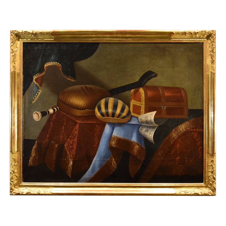 La nostra bella tela va precisamente collocata nell’ambito di questo secondo grande pittore, ed in particolare è attribuibile alla mano del figlio, Bonaventura Bettera (Bergamo, 1663 – documentato fino al 1718), e ci illustra, secondo una scenografia cara all'artista, la consueta esposizione di strumenti musicali adagiati su un piano ricoperto da un elegante tappeto drappeggiato ed inquadrati da un tendaggio a motivi dorati che scende dall’alto.