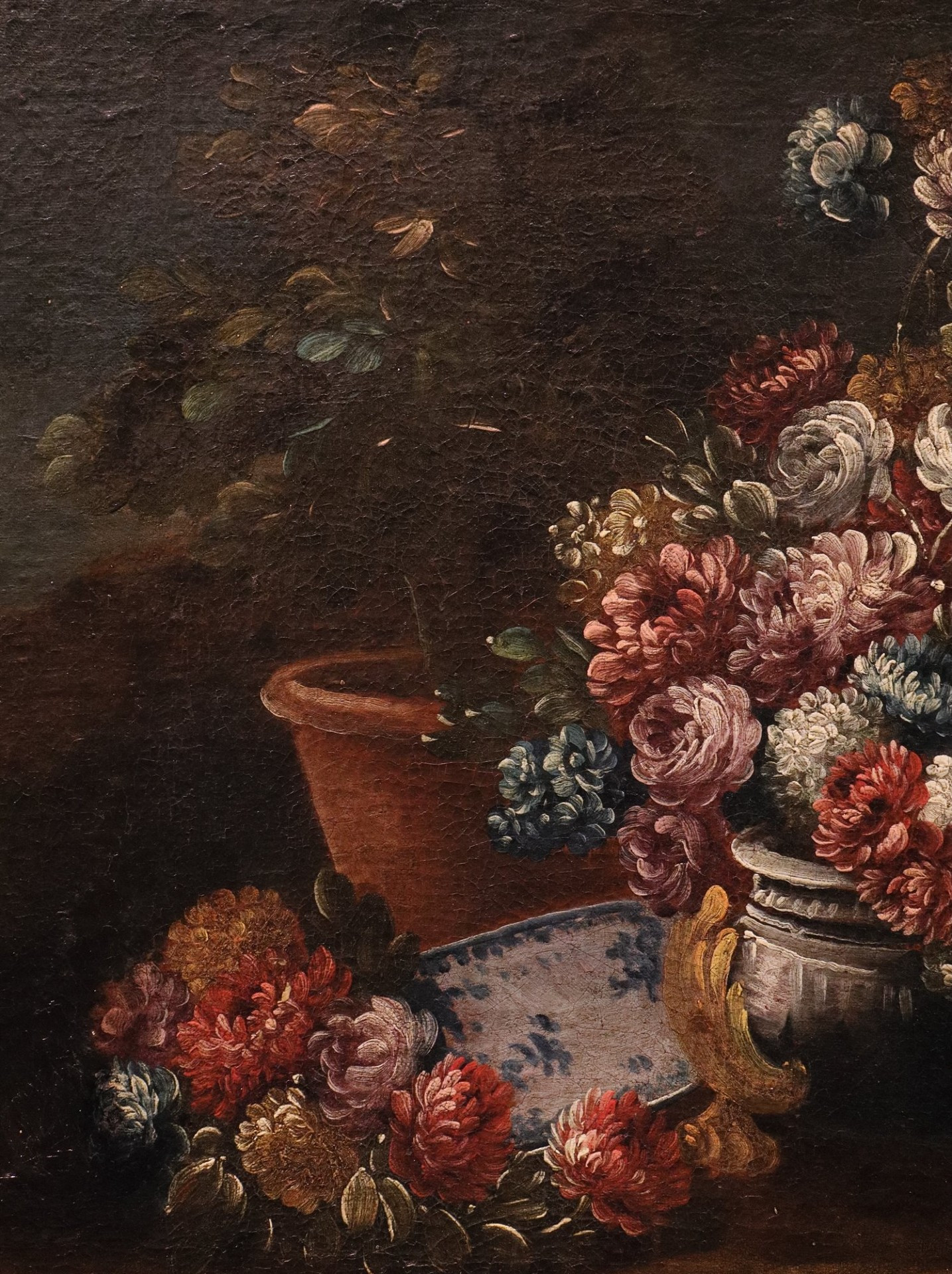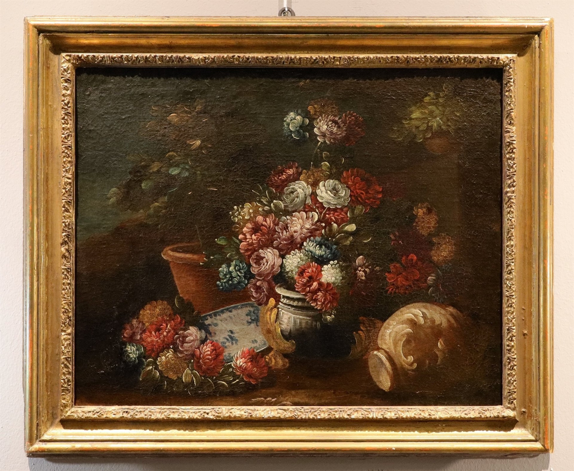 Il piacevole dipinto, raffigurante una sontuosa composizione di fiori scenograficamente disposti in un giardino all’aperto, è opera di un pittore della cerchia di Francesco Lavagna (Napoli, 1684 - 1724), uno dei più noti protagonisti della natura morta napoletana d’inizio Settecento insieme a Gaspare Lopez, entrambi formatisi presso l'atelier di Andrea Belvedere.