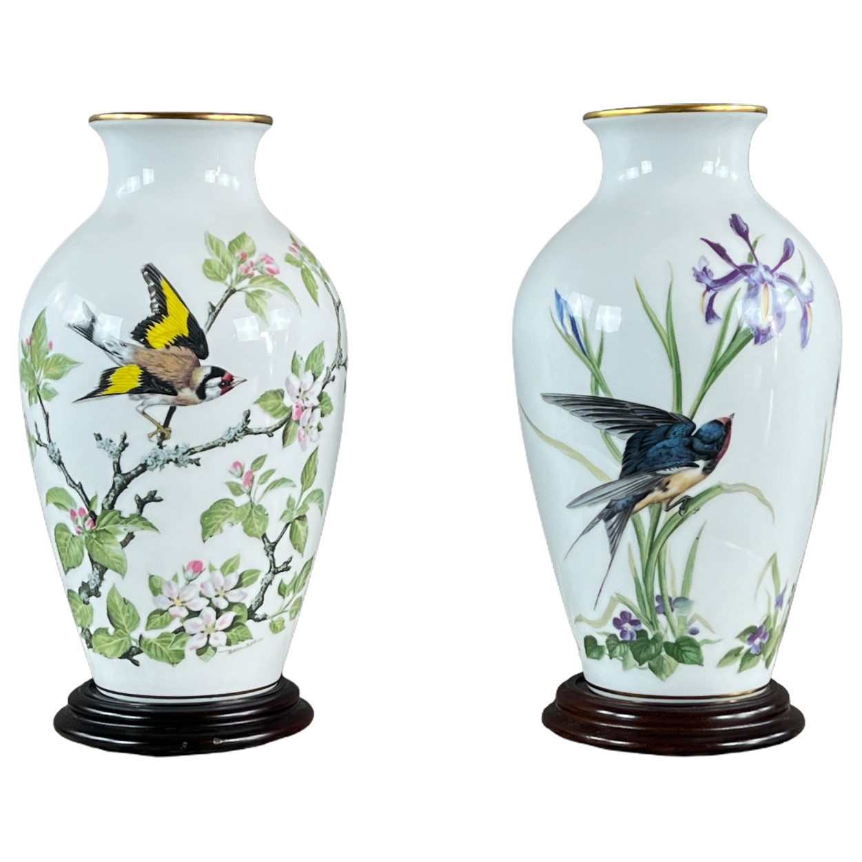Élégante paire de vases en porcelaine fine de la manufacture Franklin Porcelain, intitulée “The Meadowland Bird Vase”, d’après une création signée Basil Ede.