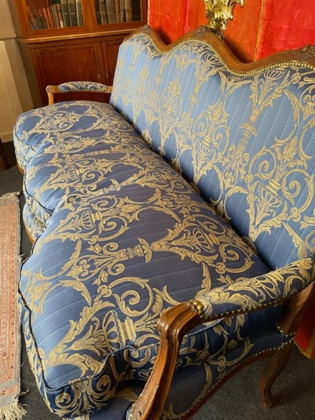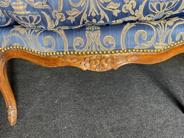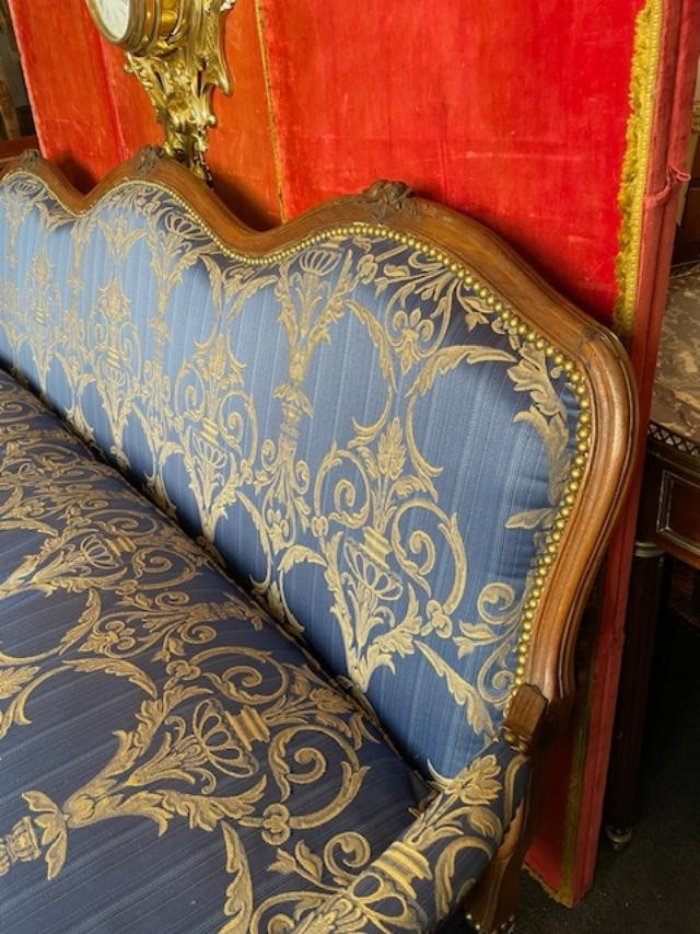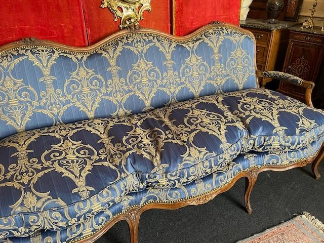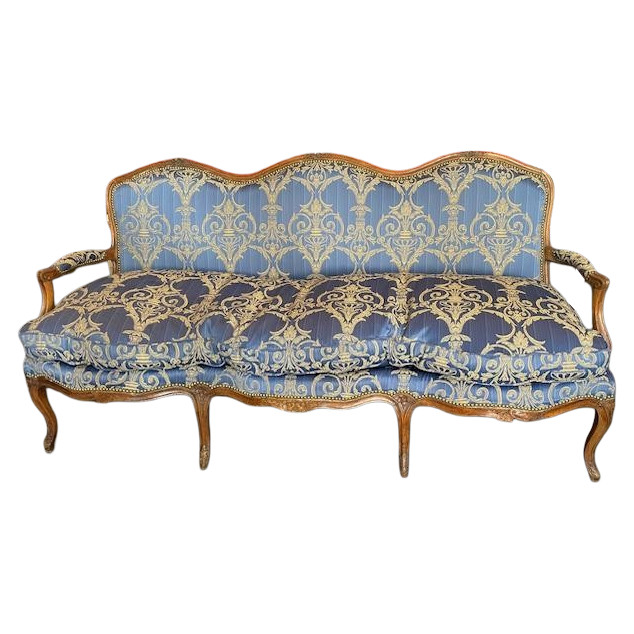Grande e bellissimo divano del XVIII secolo in legno naturale, modellato e intagliato con fiori, gambe ricurve e schienale smerlato. Rivestito in un superbo tessuto damascato blu. Molto confortevole con il suo cuscino di piume. Tappezzeria tradizionale nuova ......... Periodo Luigi XV