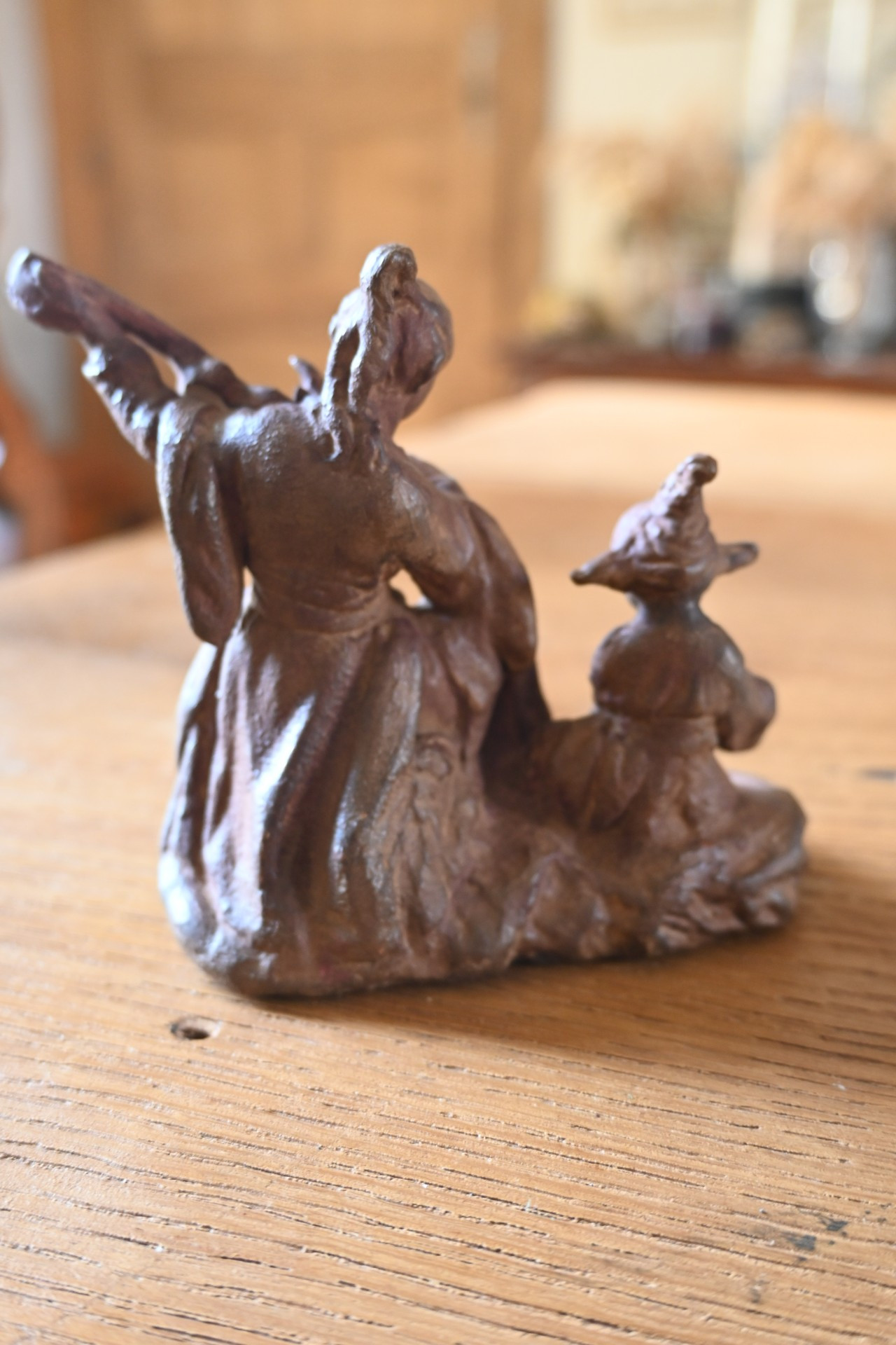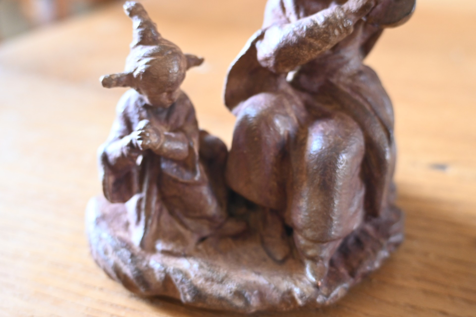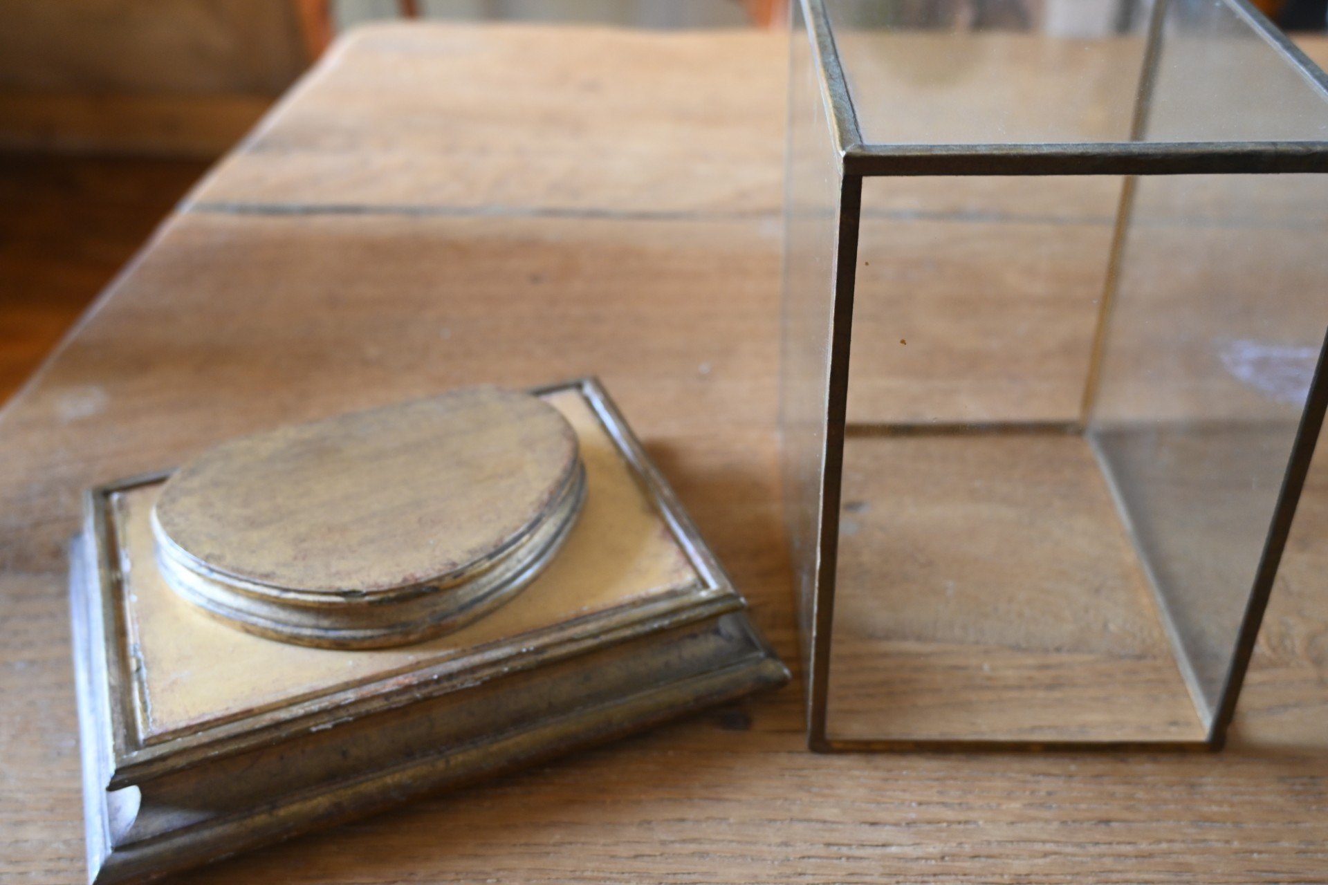 Questa è un'opera del XIX di 12,5 di ht per 12 cm di lunghezza, l'opera è presentata su una base da banco con la forma in legno intagliato e dorato e in una gabbia, tutte le facce in vetro.