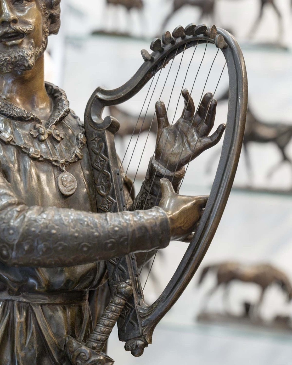 Importante stampa in bronzo, raffigurante un "Bardo", figura emblematica della tradizione musicale e poetica. figura emblematica della tradizione musicale e poetica, opera dello scultore Jean-Didier Debut.